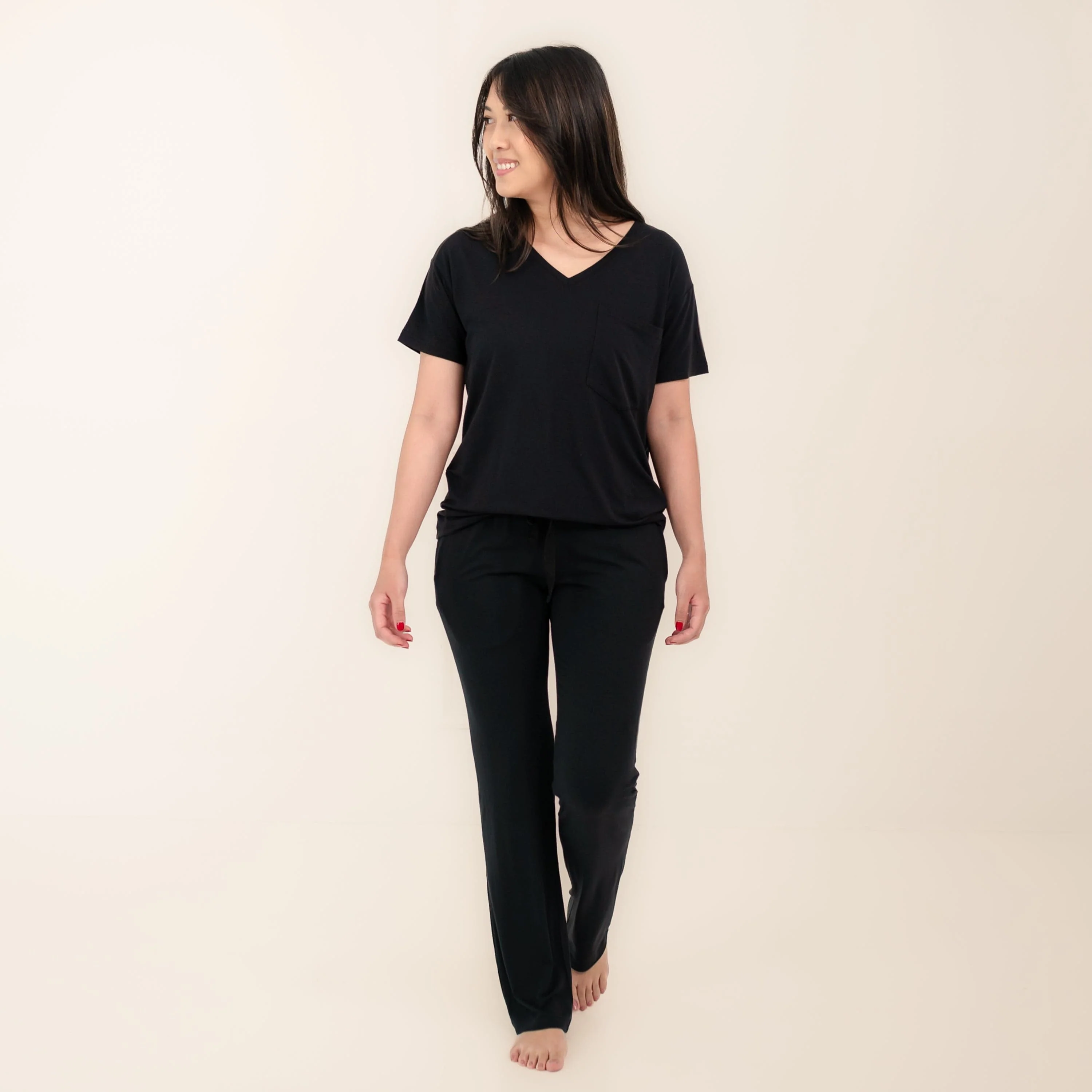 Relax in ultimate comfort and style in a pair of Kyte Baby women’s black lounge pants. Whether you’re snoozing the night away or simply having a lazy day at home, you can’t beat the buttery soft feel of our bamboo pajama pants. A drawstring waistband offers a customized fit, and wide legs with deep side pockets ensure unrestricted movement and convenience.